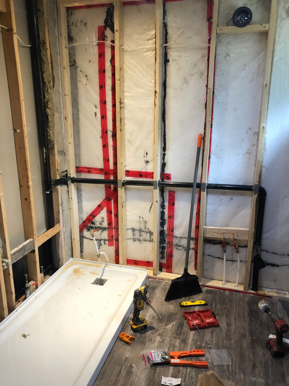 This master bath showcases an absolutely masterful makeover where rustic and modern elements seamlessly blend together. From the marble subway tile insert to the wood design laminate vinyl plank flooring, every detail exudes elegance and sophistication. The stylish vanity mirror and lighting combo, along with the warm wood trim, add the perfect finishing touches to this stunning ensuite. Experience the transformative power of visionary craftsmanship with us.